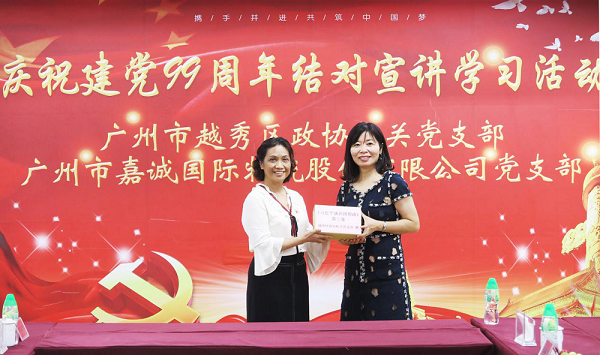 2020年是中国共产党成立99周年,是决胜全面建成小康社会和“十三五”规划收官之年。为加强党建引领,促进优化提升,8月19日,越秀区政协机关党支部联合嘉诚国际党支部开展主题党日暨“庆祝建党99周年结对宣讲学习活动”,越秀区政协副主席吴茂珠,越秀区政协党组成员、秘书长、机关党支部书记张雅丽,嘉诚国际总经理黄平,副总经理、区政协委员黄艳芸,党支部书记郑玉明等一行领导出席活动。