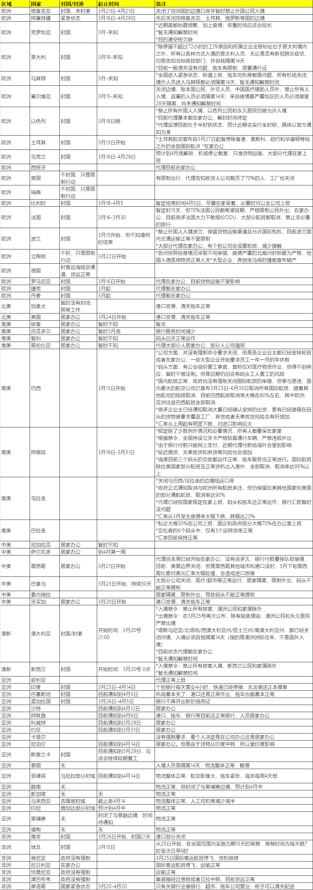 特附上最新全球64国物流动态,供大家查阅!以知悉全球物流管控政策发展动向,提前制定跨境物流业务应对措施,合理配置供应链物流资源。