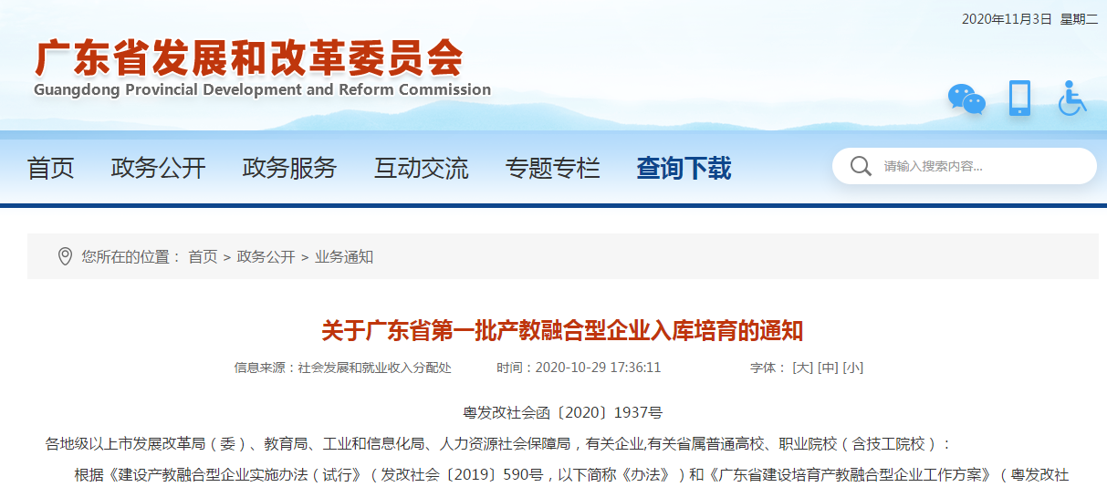 2020年10月29日,广东省发展和改革委员会发布《关于广东省第一批产教融合型企业入库培育的通知》(粤发改社会函〔2020〕1937号)文件,公布《广东省第一批建设培育产教融合型企业名单》,嘉诚国际荣列其中!