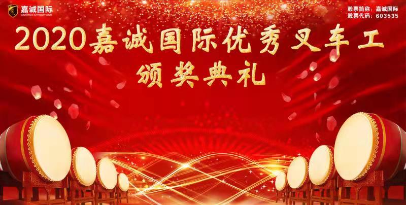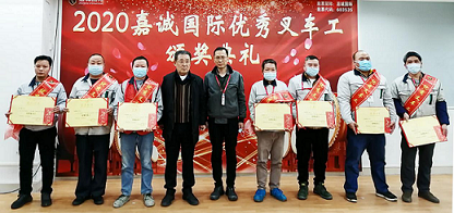 嘉诚国际第一届优秀叉车工颁奖典礼于2020年12月30日在嘉诚国际总部举行。此次评选活动由公司总务管理部和设备管理部联合主办,目的是为了表彰先进,提升归属感,树立模范,进一步激发调动员工的积极性、主动性与创造性,增强企业的凝聚力、向心力。