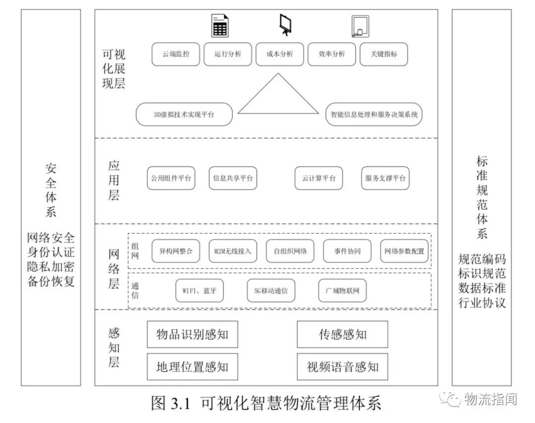 图中显示,该体系架构具有四个层面,包括感知层、传输层、应用层以及可视化展现层,每层都需要具有一定的安全体系和标准规范。其中感知层负责部署底层数据采集设备,例如仓储过程中的PDA采集器、QR码的扫码枪、传感器、视频摄像头以及语音感知设备等等,这一层主要负责数据的收集和整合。