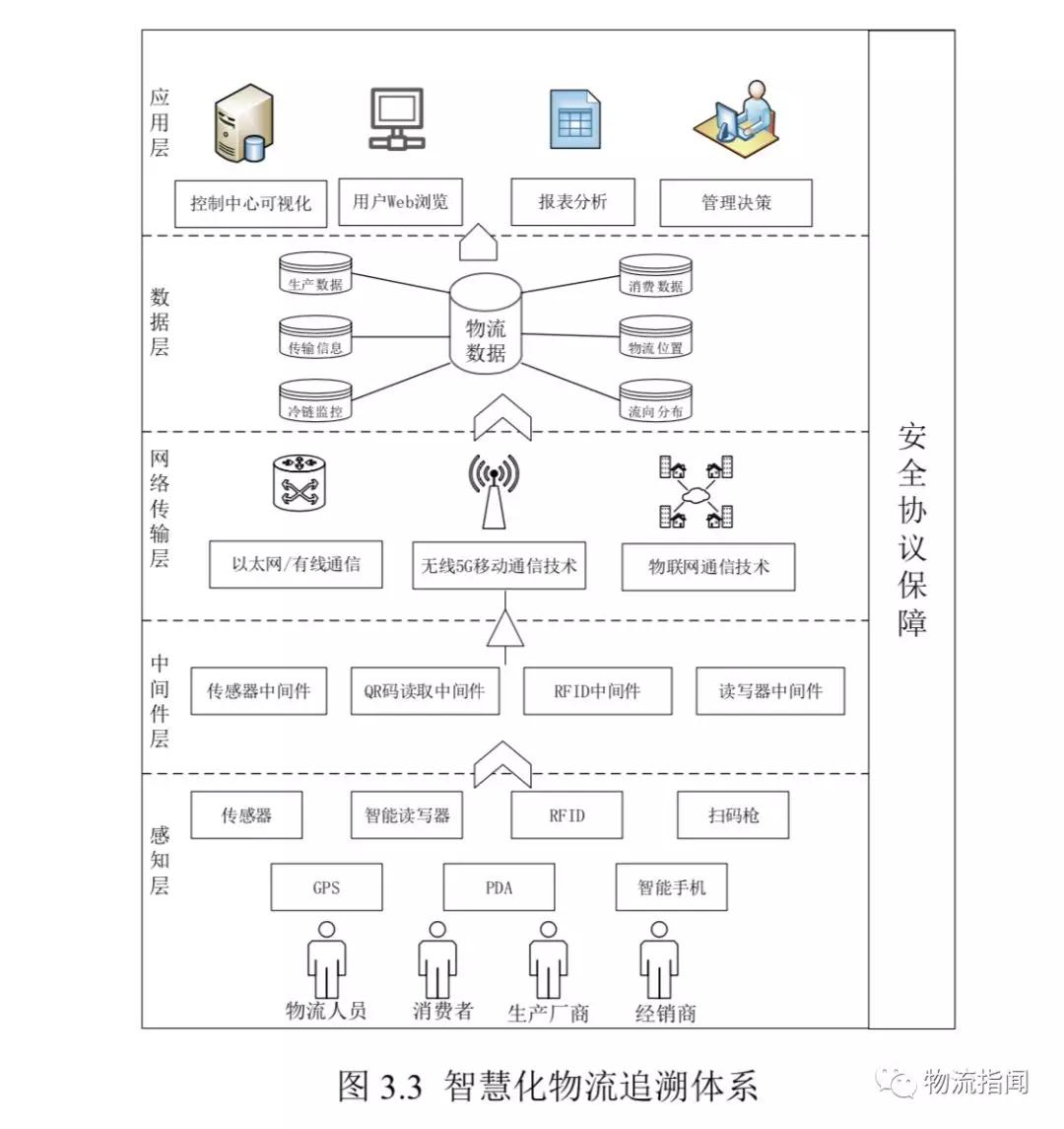 智慧化物流追溯体系使用物联网和互联网技术实现产品的追踪和溯源,厂商可以对物品正向物流进行可控查询和报表分析,用户在收到物品后可以通过平台或者软件进行物品的反向信息溯源,目前使用较多的是农副产品和冷链物流体系。智慧化物流追溯体系从本质上讲就是利用物联网技术建立一个分布式多节点的信息共享链,因此5G就是这个信息共享链的数据流动媒介。和物联网的多层基础架构类似,智慧化物流追溯体系也具有自底向上的多层次架构,具体架构如图3.3所示。