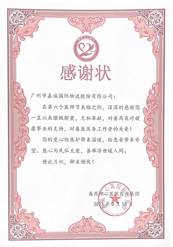 8月18日,番禺区中心医院医疗集团向嘉诚国际发来感谢状,以感激嘉诚国际一直以来奔走在爱心捐献的前线,为支持医疗事业发展,改善医护人员工作环境,保驾护航人民群众身体健康所做出的积极贡献。